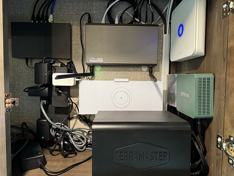 Cables are tucked as neatly as possible behind cabinet panels, and for now, on hot days we just leave the cabinet door open for airflow. But I’ve already got plans for small USB fans to keep things cool when the doors are shut—because tech gear in a hot RV cabinet is basically a recipe for crankiness.