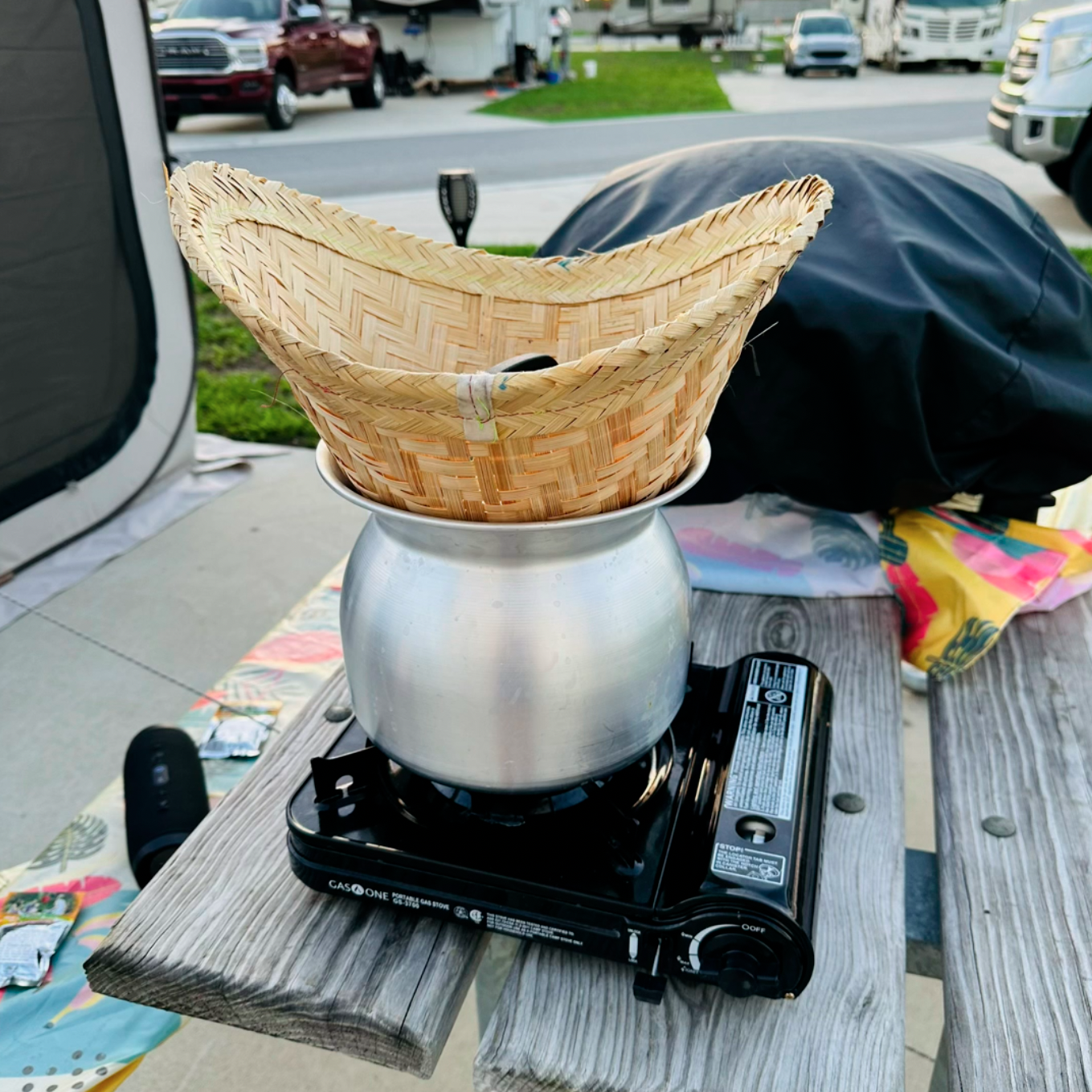 RV cooking doesn’t look like survival food for us. It looks like sticky rice in a bamboo basket. Fresh dragon fruit on the counter. Glass noodle salad tossed in a metal bowl. Meals that still feel like home.